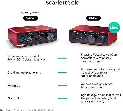 - Pro performance with great pre-amps – Achieve a brighter recording thanks to the high performing mic pre-amps of the Scarlett 3rd Gen. A switchable Air mode will add extra clarity to your acoustic instruments when recording with your Solo 3rd Gen.
